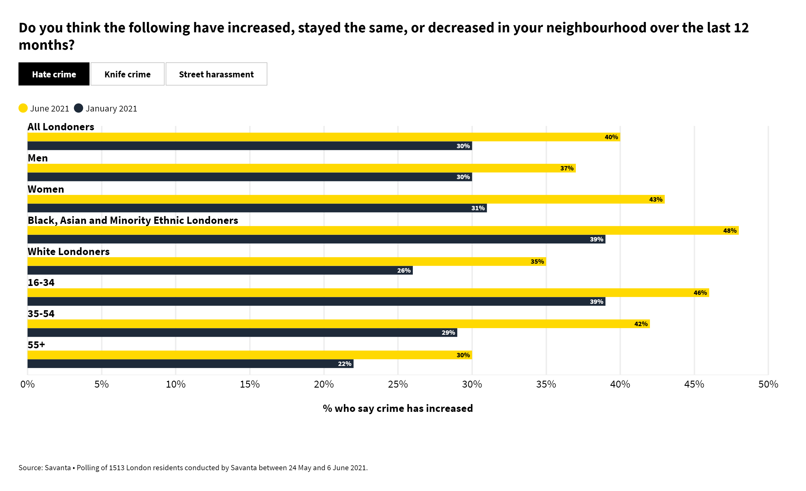 Of the types of crimes 16-34 year olds were asked about, the largest proportion (49 per cent) believe that knife crime was on the rise. This compares to 43 per cent when the same question was asked in January. Although weapon-enabled crime actually decreased whilst lockdown rules were in place, this rise in concern might be explained by media coverage of several high-profile violent incidents in recent months. Heightened awareness of the issue may be the main driver of rising concern amongst an age group already more likely to be the victims of knife crime than older residents. 22 teenagers have been killed in the capital so far this year already, exceeding a total of 14 in 2020. This is a stark reminder that protecting young lives from violent crime remains as critical as it was prior to the pandemic, with no room for complacency about the fall in violence during lockdown being anything other than a temporary blip.