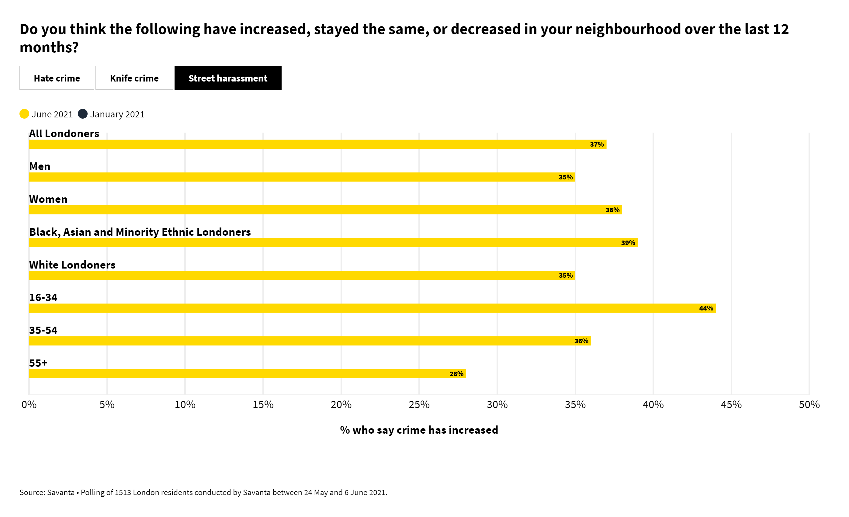 Although the growing unease about all three categories of crime was unanimously expressed by every age group polled, it isn’t a sentiment felt equally amongst them all. In comparison with other age groups, 16-34 year olds are the most likely to feel hate crime is on the rise; more than 15 percentage points higher than the group least likely to express concern, over-55s (30 per cent). Likewise, young Londoners were the most concerned group about harassment and knife crime, both much more so than older Londoners. So it is evident that young Londoners are more concerned about crime, indicating the need for targeted action to help them feel safer.