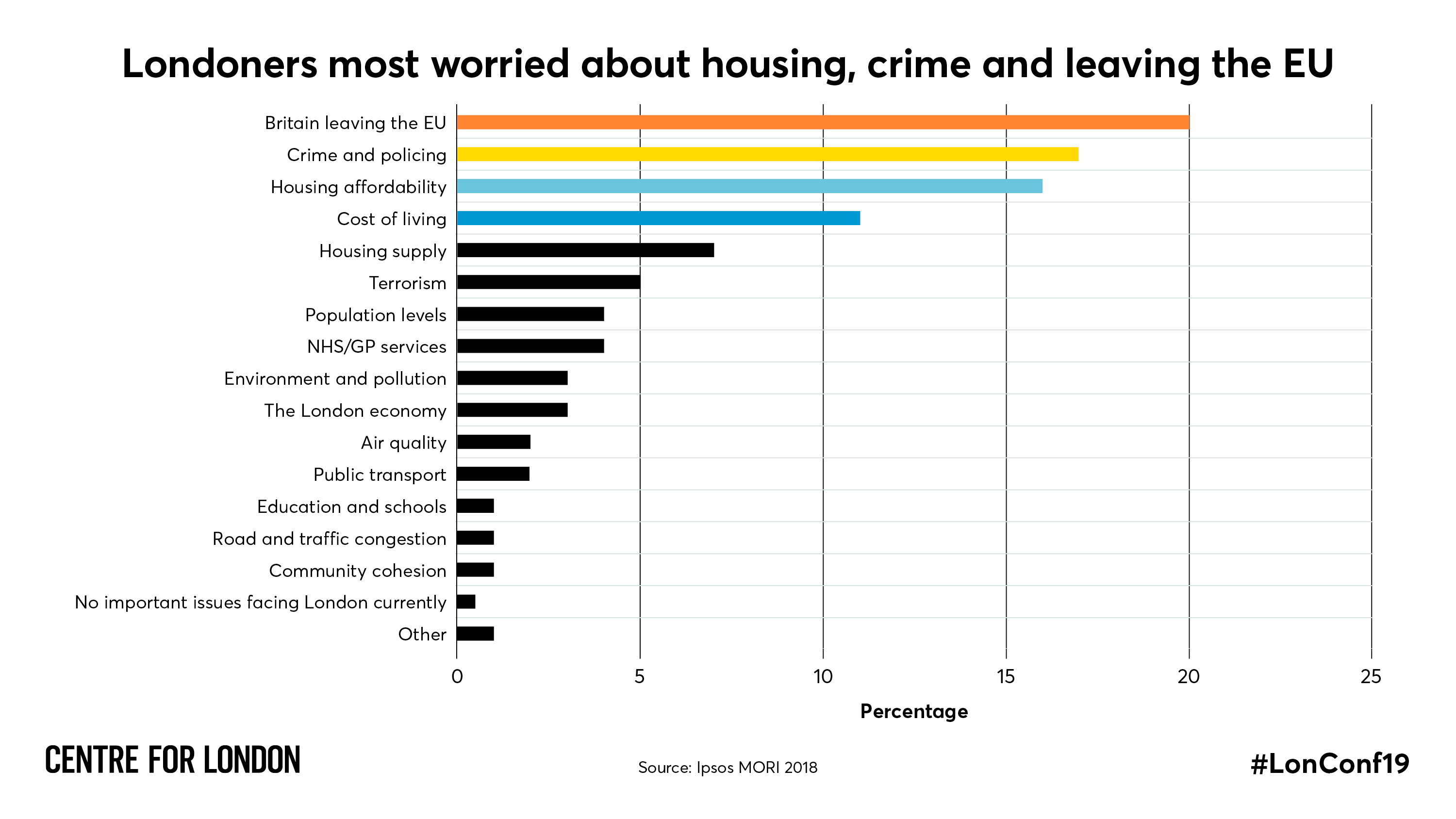 Ipsos Mori has been tracking the issues that worry Londoners most. This shows you what Londoners say is the top issue for London, rather than for the nation as a whole. It shows that worries about migration have become less salient. Worries about the economy have been replaced by worries about Brexit. Concerns about the environment have increased but not as much as concern about crime. And housing remains a top concern. The hardy perennial of London issues.