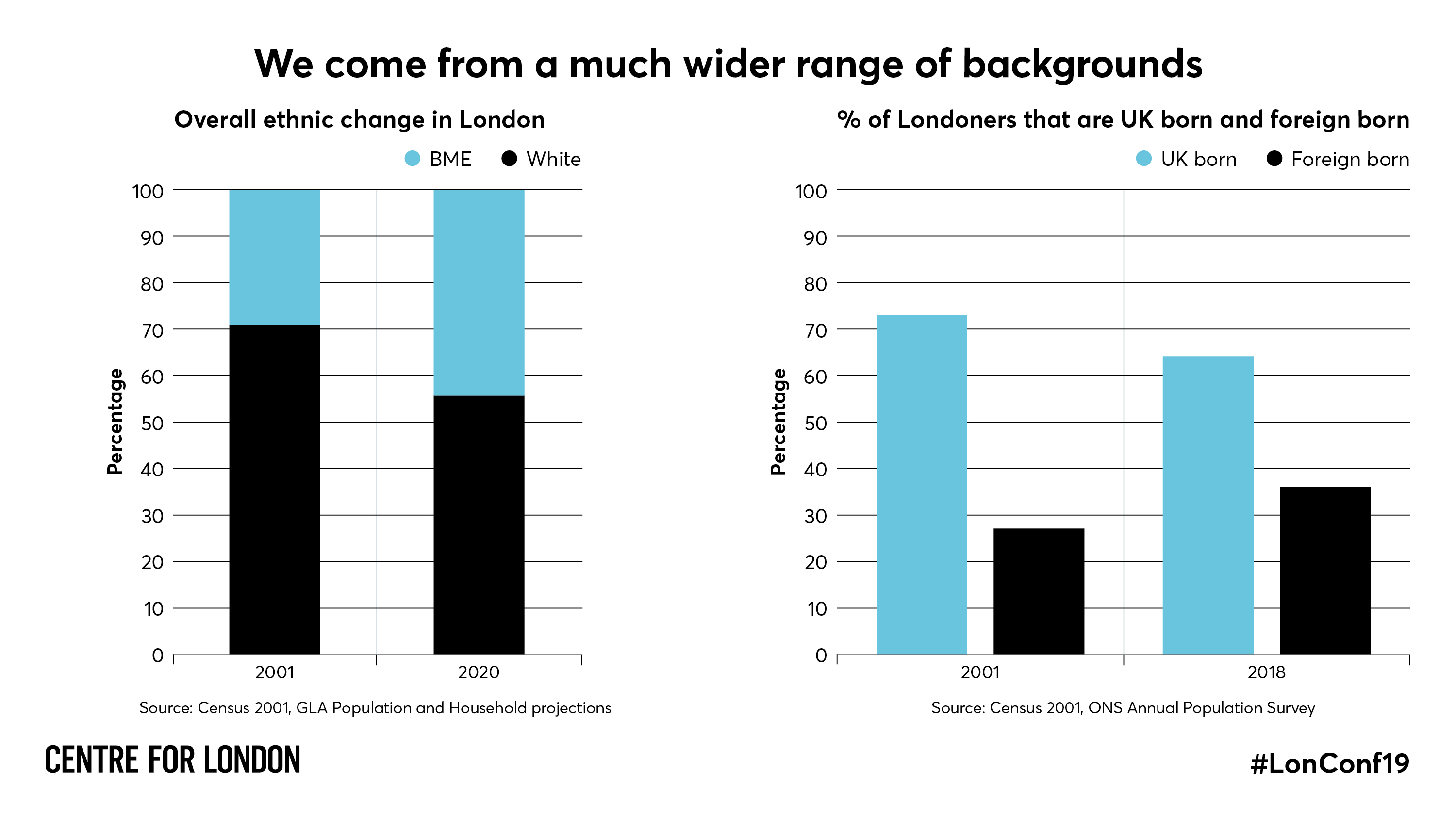 London has become more diverse. In 2001, 30 per cent of Londoners were from an ethnic minority background, now it’s nearly half. A quarter of Londoners were born abroad, now it’s a third. The city also has a rapid population turnover.