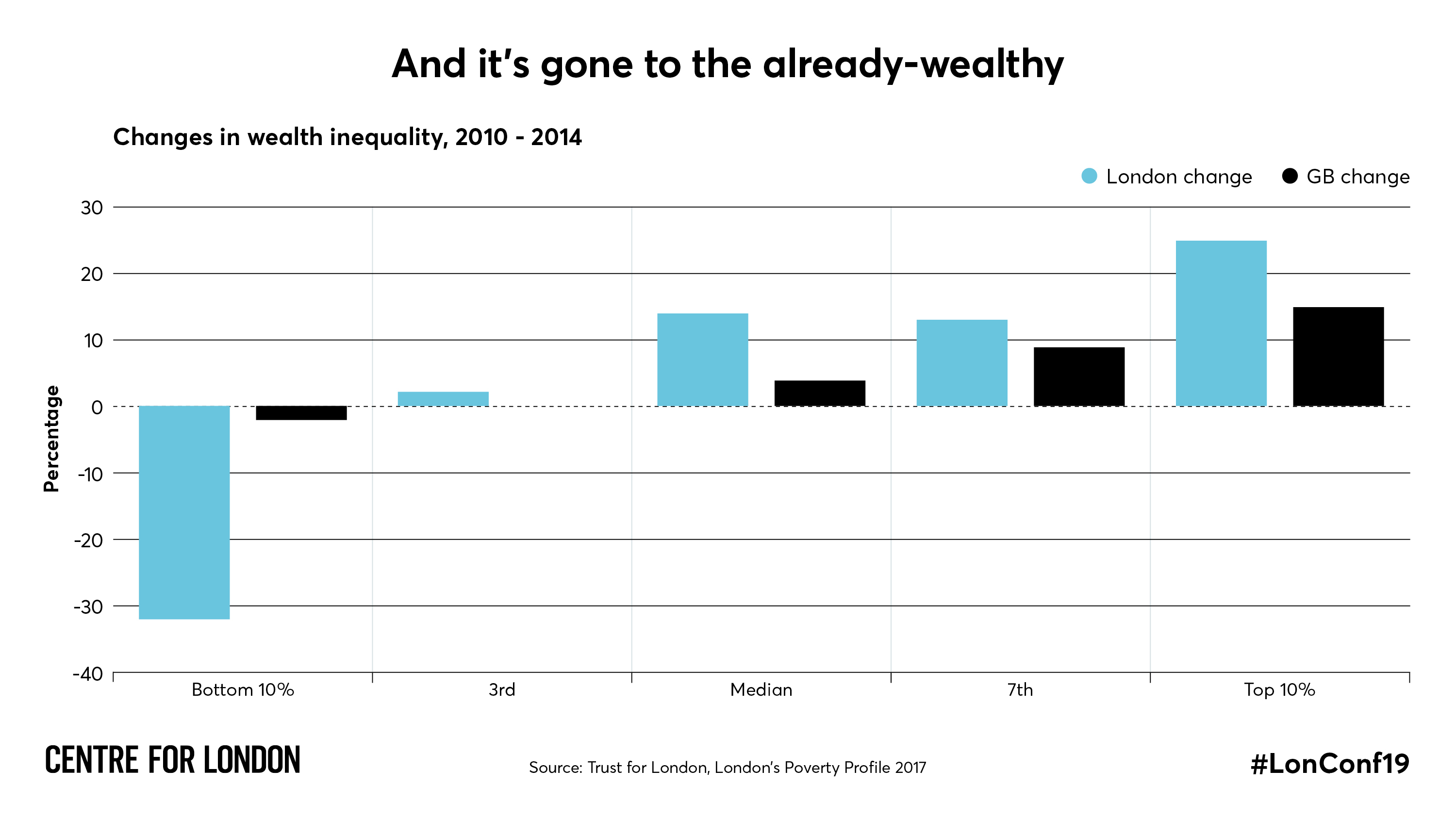 London has got hugely ‘richer’ – at least as measured by property and other assets. Total wealth has increased almost doubled in London – from £1 to £2 trillion. But wealth is unevenly distributed across the capital. It has all gone to the richest half and even more so to the richest 10 per cent.