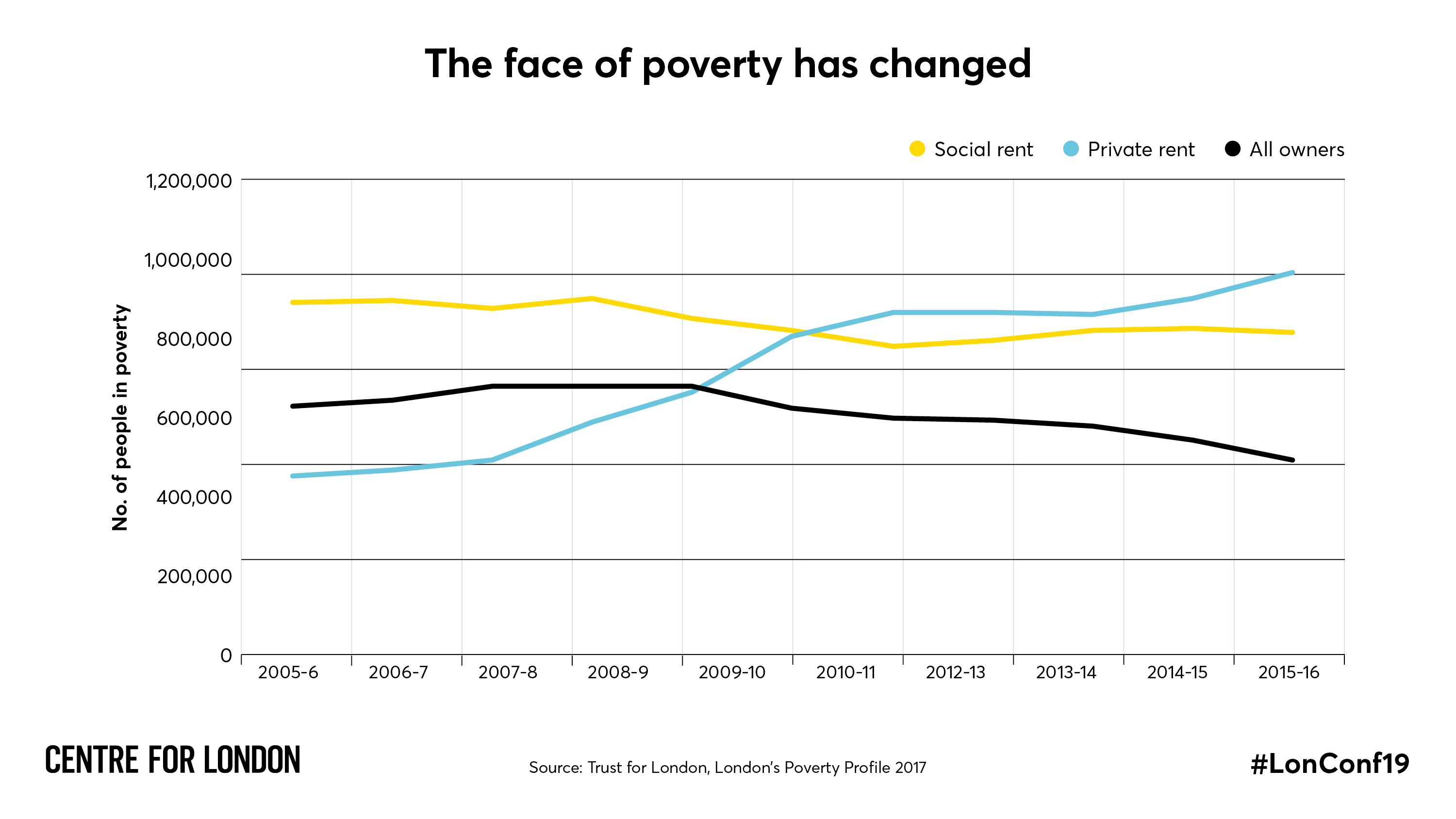 Poverty rates have also been rising among those in the private rental sector. Against the background of a growing population, we have seen a decline in the number of social tenants or homeowners living in poverty but an increase from half a million to a million among those renting privately.
