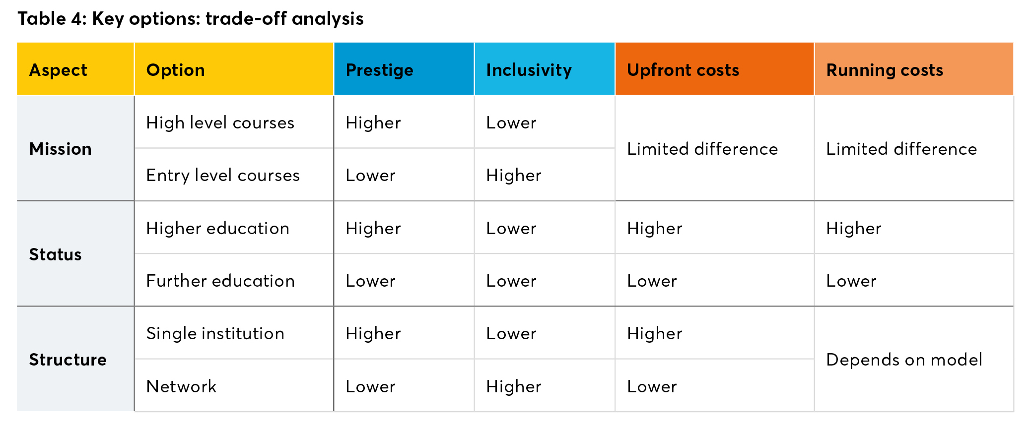 There are clear trade-offs between offering entry-level and high-level courses, in terms of cost, prestige and inclusion. In general, more elementary courses will be delivered to more students – so there is the potential to generate high volumes of work and achieve economies of scale. However, they tend to be shorter, so the ratio of effort in recruitment to time spent with each student will be lower, and there is less opportunity to build up relationships with a learner over time. Providing higher level courses reduces the potential number of students and also reduces the ability to attract entirely new entrants to the profession, but may be more effective in building prestige and addressing shortages for specific skills. Indeed there is a need for training which is fairly advanced but is not delivered within the highly specialist and expensive private cooking schools.