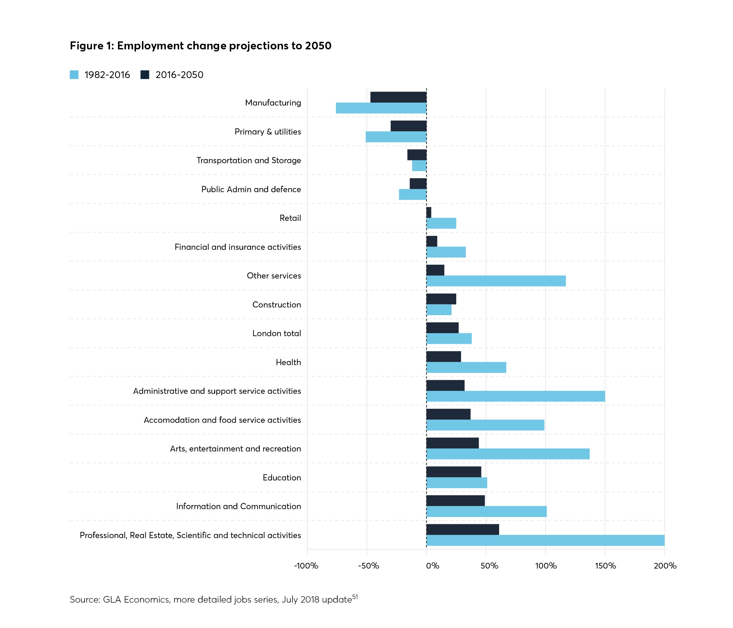 According to projections produced by the Greater London Authority, the growth in employment that London has experienced in the last 30 years is expected to persist during the next 30, albeit at a slower pace 12. The GLA expects little change in the sectors driving employment growth: the professional services, information and communication, culture and hospitality sectors will continue to expand, while the decline in public administration jobs and some industry (such as manufacturing) is expected to continue – though not as pronounced as before.
