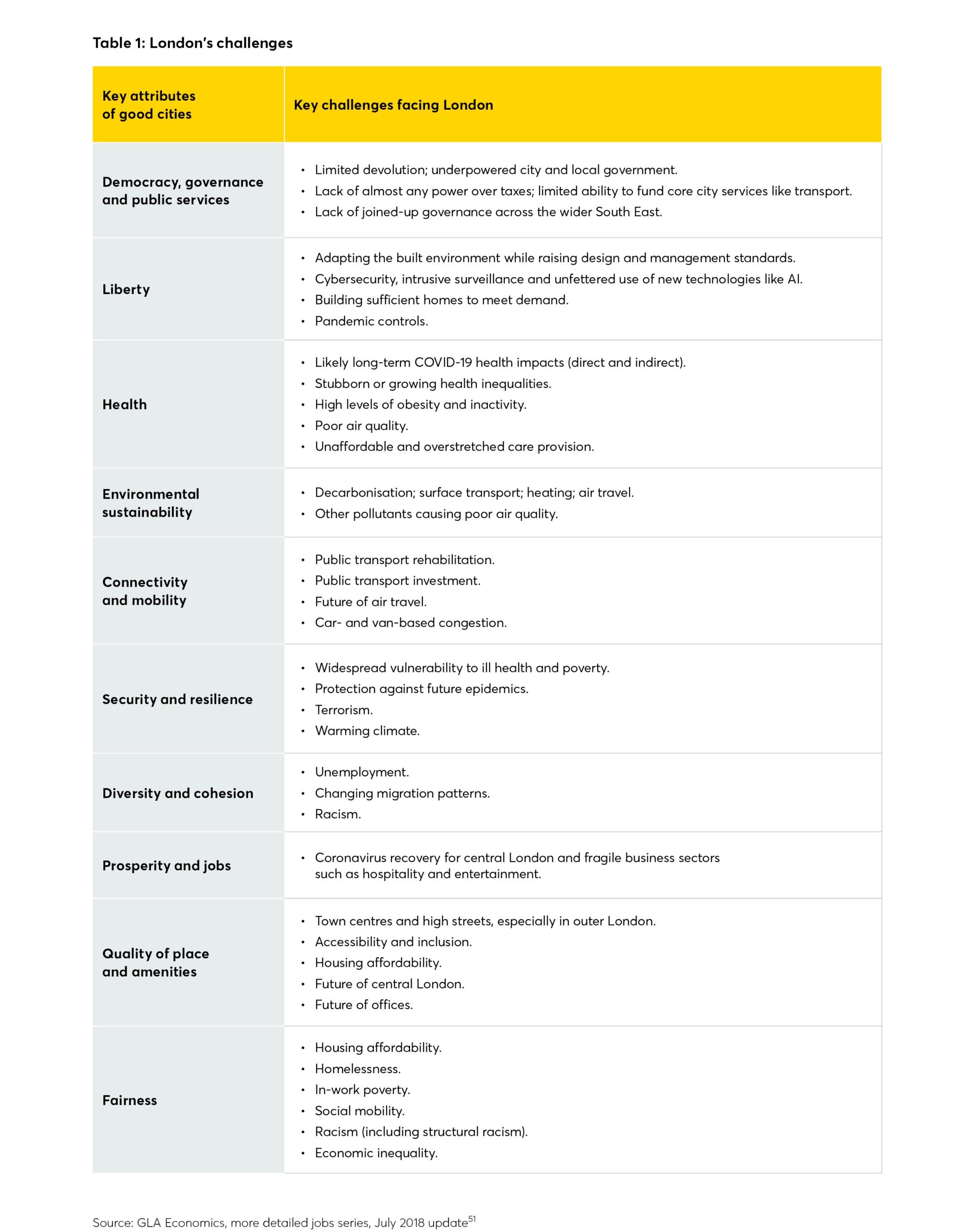 At the outset of the London Futures project, the question we posed was whether London could continue to seize opportunities and prosper while also addressing its stark inequities. Other challenges to be addressed included the climate emergency, new technologies, changing global trade and power structures, and an ageing population. We concluded the London at a Crossroads report by detailing the major challenges we saw ahead (see Table 1 on the next page).