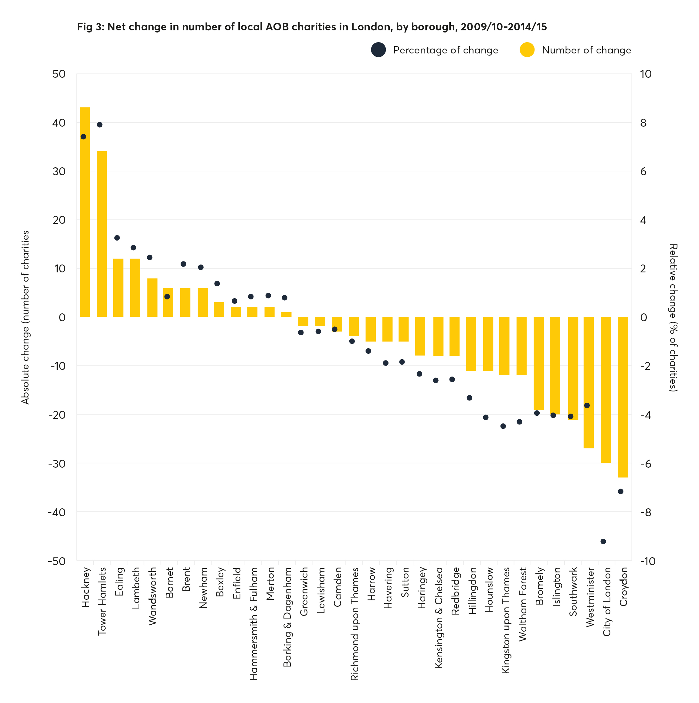 We also looked at changes in the number of London focused charities over the five years up to 2015.  We found that while the overall number of charities in London has grown, the number of charities focused on London causes plateaued. Again, the pattern looks very different according to borough.  Hackney and Tower Hamlets have seen a big increase in locally focused charities – no doubt reflecting their relative economic dynamism and thriving ‘start-up scene’. Most other areas have seen a fall. This includes inner London boroughs like Westminster (-4%) and Southwark (-4%), but is particularly notable in outer London ones, including Croydon (-7%), Kingston (-5%), Bromley, Waltham Forest, Hounslow and Hillingdon (all –4%). The decline in outer London charities is particularly concerning given that, as Centre for London has shown, London’s economic geography is changing, with poverty spreading from its heartlands in ‘old London’ to the outer London boroughs. 7