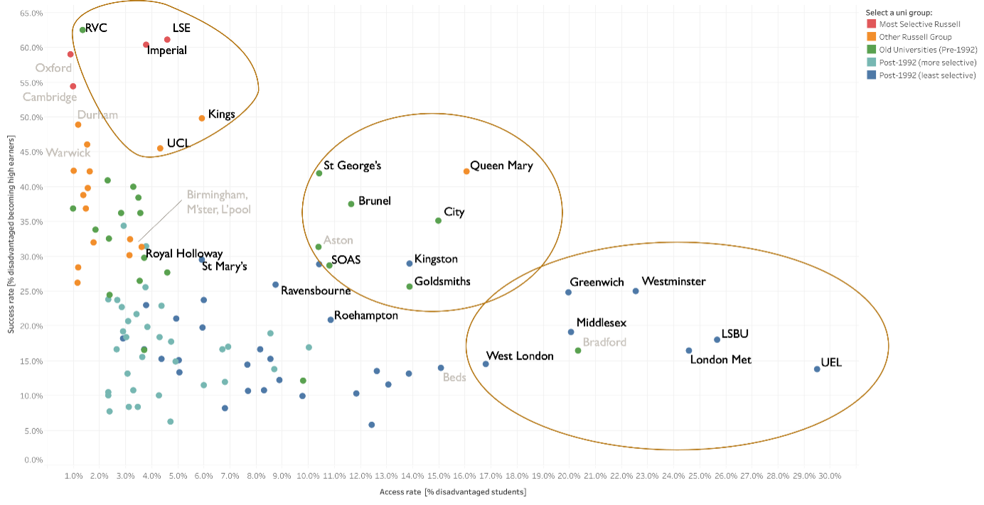 The Sutton Trust/Institute for Fiscal Studies index for social mobility has created a combined mobility score for universities by looking at both access (what percentage of students at the institution were receiving free school meals at 16), and success (what percentage of these students enter the top 20 per cent of incomes by age 30). The institutions that rank highest on this index are located in London, combining high access rates with good earnings outcomes – and this applies across the board from high tariff to more accessible institutions.