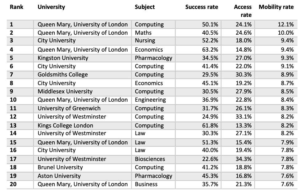 Some London universities also have a course offer that appeals to students from less advantaged backgrounds. University courses that score the highest for social mobility nationally include pharmacology, computing, law, economics, and business. These reflect a tendency for young people from disadvantaged backgrounds to opt for more vocational courses, rather than arts, humanities, or languages. Institutions in London offer some of the most successful and accessible courses in these categories – 19 of the top 20 courses are in London higher education institutions.